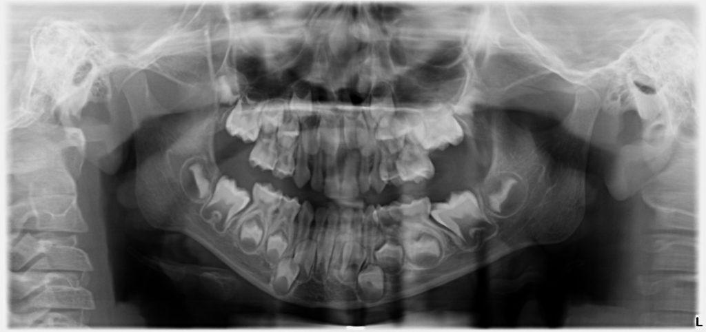 Bu sebeple bu hastamızdan da hasta velilerine “çene filmi” dediğimiz, panoramik çene grafisi istedik. Hasta velisi için görünüşte 1 tane zannedilen çürüğün aslında, 8 süt azı dişinin 8’inde de olduğunu görmüş olduk. Süt dişi çürükleri çok hızlı ilerlediği ve sinirleri daha yüzeye yakın olduğundan hemen ağrı yaptıkları için, bu çürüklere de tedavi planladık.
